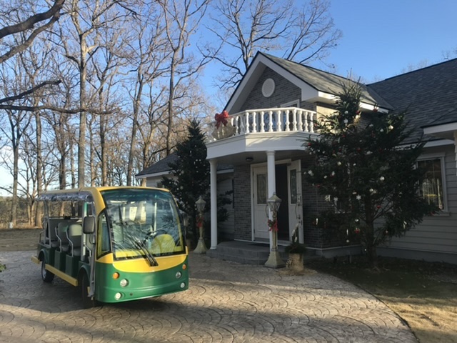 入り口の門に近づくと門は自動で開き、車を駐車場に停めると上の写真の可愛い乗り物で迎えに来てくれました。
